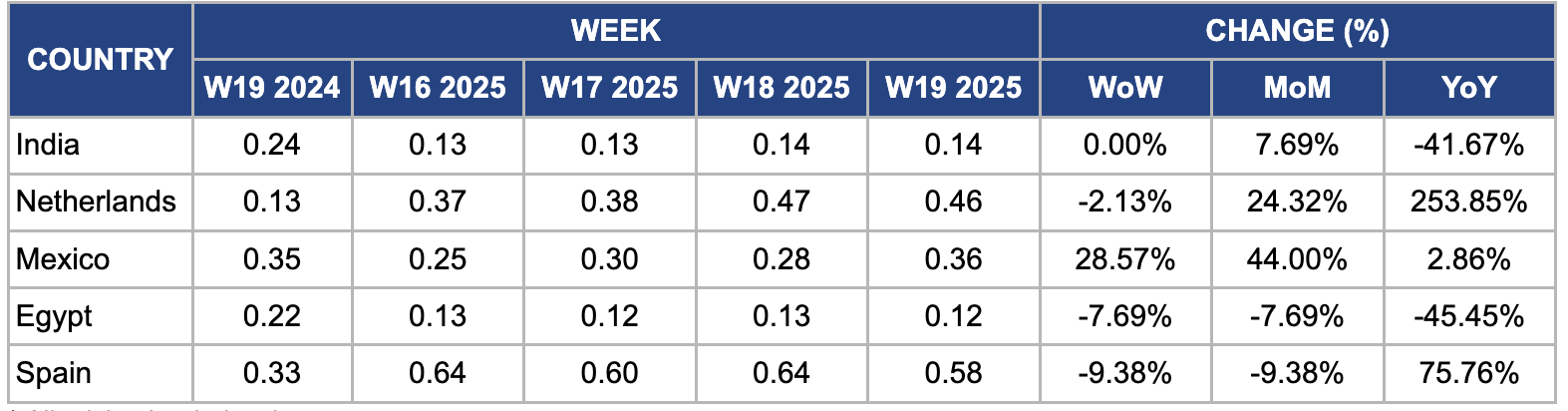 In W19, Mexico's onion prices surged by 28.57% WoW and 44% MoM to USD 0.36/kg, driven by a combination of seasonal supply constraints and increased demand. The onset of the new harvest season typically leads to lower prices. However, adverse weather conditions, such as droughts and heavy rains, affected onion yields in key producing regions like Chihuahua and Zacatecas. These weather disruptions have limited supply, pushing prices higher. Moreover, strong export demand, particularly from the United States (US), has further strained domestic availability, increasing prices. Despite these challenges, the quality of Mexico's onions remains high, and production will stabilize as the season progresses.