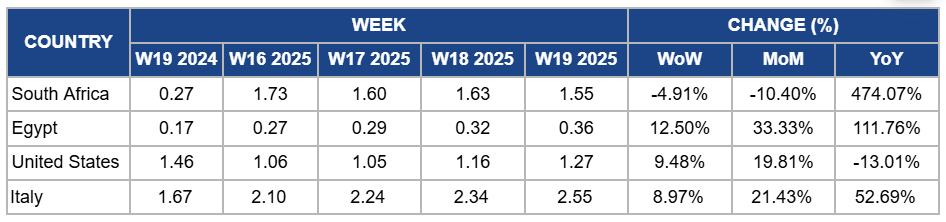 Orange prices in Egypt increased by 12.50% WoW to USD 0.36/kg in W19, with a 33.33% MoM rise and a 111.76% YoY surge due to a sharp reduction in harvest caused by abnormal heat during the flowering period, which affected fruit development and led to lower yields. Around 90% of the oranges harvested were medium-sized, limiting the supply of larger fruits preferred in premium export markets. Additionally, domestic demand rose as orange concentrate factories offered better payment terms, increasing competition for available volumes. The government’s reduction of export subsidies from 8% to 10% to 2.5% also led exporters to raise prices to cover rising costs.