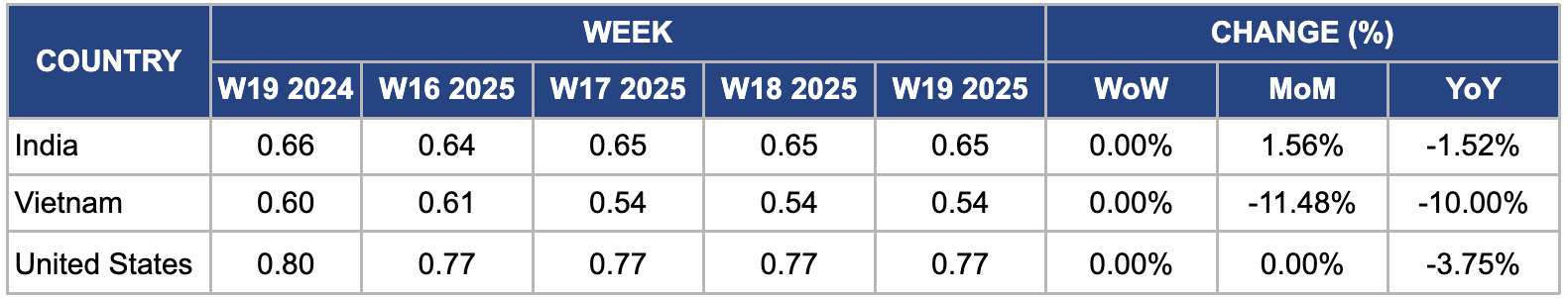 In W19, India's wholesale rice prices remained stable week-on-week (WoW) at USD 0.65 per kilogram (kg) but rose 1.56% month-on-month (MoM) as domestic supply tightened due to delayed monsoons and droughts in key states like Uttar Pradesh and Punjab, which raised concerns over yield reductions. Strong export demand from Bangladesh and Sri Lanka, which faced local shortages, contributed to the upward pressure. India's rice shipments to Bangladesh increased by 15% YoY in Q1-2025. Global supply constraints from weaker harvests in major exporters such as Vietnam and Thailand further elevated India's role in international markets, supporting continued price firmness.