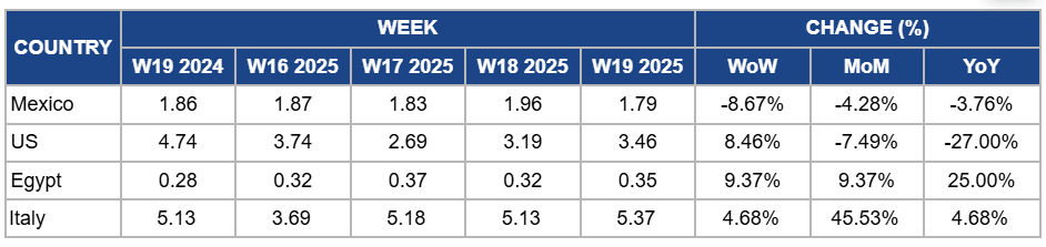 Strawberry prices in Mexico dropped by 8.67% week-on-week (WoW) to USD 1.79/kg in W19, with a 4.28% month-on-month (MoM) decrease and a 3.76% YoY decrease due to peak seasonal harvests in May-25 in major producing regions such as Michoacán and Baja California, which boosted supply in both domestic and export markets. The price drop is due to increased volumes outpacing demand, especially as export activity to the US begins to taper off with the start of California’s season. Additionally, milder weather conditions have favored higher yields, intensifying market competition and placing downward pressure on prices.