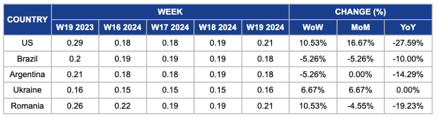 The US maize price witnessed a significant 10.53% week-on-week (WoW) and 16.67% month-on-month (MoM) increase, reaching USD 0.21 per kilogram (kg), up from USD 0.19/kg in W18. Concerns over delayed planting in the US and flooding in southern Brazil fuel this uptick.