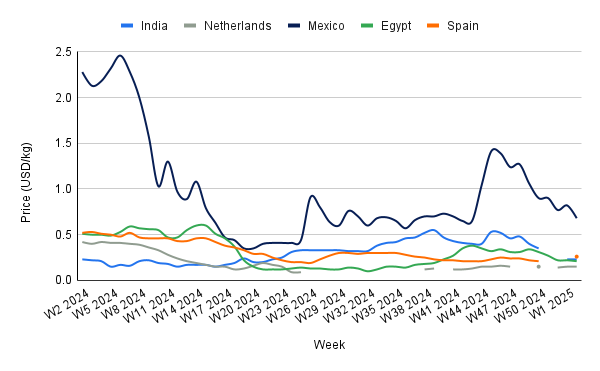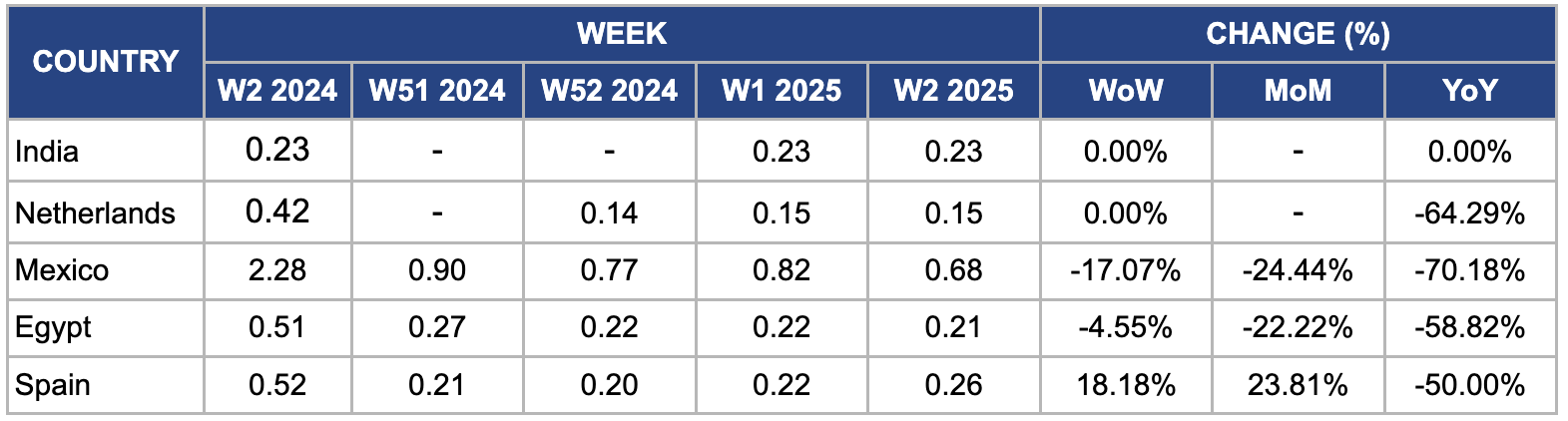 In W2, Mexico's onion prices decreased 17% WoW and 24.44% month-on-month (MoM), reaching USD 0.68/kg. This decline is mainly due to cold weather conditions affecting key onion-producing regions, such as Puebla and Guanajuato. The cold fronts have disrupted crop development and harvesting. Furthermore, the cold weather has delayed the onset of onion shipments, pushing the start of exports to mid-Feb-25. This supply constraint has further tightened the market.