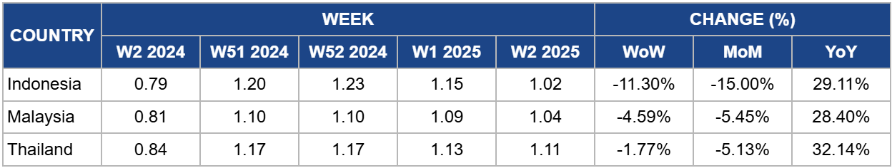Thailand's palm oil prices decreased to USD 1.11/kg in W2, reflecting a 1.77% WoW decline, though prices are 32.14% higher year-on-year (YoY). The outlook for palm oil production in 2025 remains positive, supported by the maturation of new plantations established following favorable price conditions in 2022. However, the decision to maintain a low biodiesel blending ratio of B5 is expected to limit demand for palm oil in biofuel production. Additionally, a slight decline in exports to 1 mmt is anticipated. These factors, combined with stable domestic consumption, could result in modest price adjustments in 2025, as market dynamics in both biofuel demand and production influence price stability.