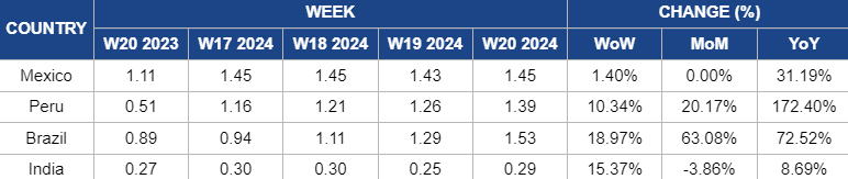 Mexican mango prices in W19 decreased slightly due to a brief improvement in supply conditions. However, prices increased by 1.40% week-over-week (WoW) to USD 1.45/kg in W20, driven by continued disruptions from the El Niño effect and low harvest volumes, especially of larger fruits. Despite a consistent supply of mangoes throughout the season from Mexico's multiple growing regions, prices have slightly increased. This increase amounts to 31.19% YoY. Heightened demand, driven by South America's slower crop recovery, has put pressure on the available supply, leading to the price rise.