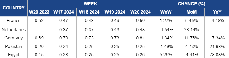 In W20, the price of potatoes in France slightly increased to USD 0.50/kg from USD 0.49/kg in W19, representing a 1.27% week-over-week (WoW) increase and a 5.45% month-on-month (MoM) change. This rise is attributed to decreased potato supply, driven by reduced production and ongoing climate challenges such as flooding and droughts, which continue to pose significant threats to future crops.