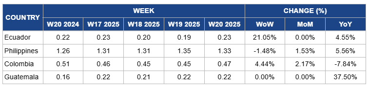 In W20, banana prices in Ecuador surged by 21.05% week-on-week (WoW) to USD 0.23/kg, with no month-on-month (MoM) change and a 4.55% YoY increase. This price rise is due to strong demand in key export markets, particularly Europe, the US, and Russia, which have absorbed much of Ecuador's supply. Additionally, logistical challenges, including rising freight costs and container shortages, have constrained export volumes, tightened supply, and pushed prices upward. The Ecuadorian government's increase in the minimum support price for bananas to USD 7.25 per box in 2025 has also contributed to higher market prices. Furthermore, adverse weather conditions in competing banana-producing countries have reduced their output, leading importers to rely more heavily on Ecuadorian bananas, thereby increasing demand and supporting higher prices.