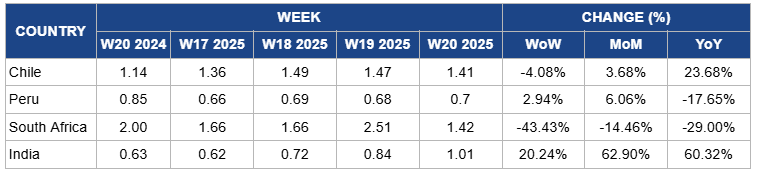 In W20, Chile's grape prices dropped by 4.08% week-on-week (WoW) to USD 1.41/kg, due to an oversupply in key export markets such as the US and Europe. This oversupply reduced demand for Chilean grapes as these markets faced increased availability from multiple sources, including delayed shipments, increased Chilean harvest volumes, and overlapping supply from Peru. The intensified competition exerted downward pressure on prices. However, month-on-month (MoM) and year-on-year (YoY) prices rose by 3.68% and 23.68%, respectively. This increase was driven by strong early-season demand for premium grape varieties such as Autumn Crisp and Sweet Globe, which commanded higher prices during the initial weeks of the season despite short-term weekly fluctuations.