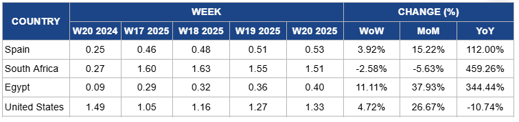 In Egypt, orange prices increased by 11.11% WoW to USD 0.40/kg in W20, with a 37.93% MoM rise and a substantial 344.44% YoY surge. This sharp escalation is due to a significant reduction in orange production, which declined by 12% in the 2024/25 season because of adverse weather conditions during flowering and fruit set, leading to a 15% decrease in exports. Additionally, heightened demand from the juice processing industry, spurred by global shortages and rising juice prices, has diverted more oranges from the fresh market, tightening supply and elevating prices. Logistical challenges, including disruptions in Red Sea shipping routes, have further constrained exports, intensifying the supply-demand imbalance.