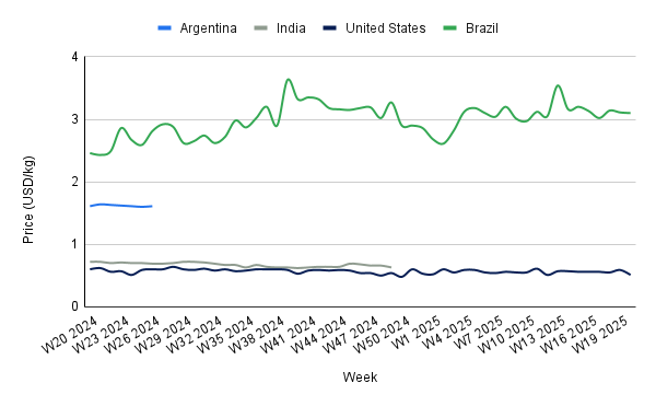 In W20, Brazil's peanut prices declined slightly by 0.32% WoW to USD 3.10/kg, reflecting a significant 26.02% YoY increase from USD 2.46/kg. This short-term price softness reflects strong harvest volumes and high-quality output reported in W17, bolstering export prospects. However, persistent rainfall poses a risk of harvest delays and crop damage, potentially tightening supply. If adverse weather continues, it could reverse the recent price decline and drive prices upward in the medium term, indicating that Brazil's peanut market remains sensitive to climatic conditions impacting supply stability.