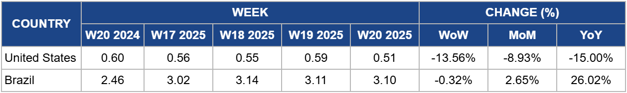 In W20, US peanut prices fell to USD 0.51 per kilogram (kg), reflecting a 13.56% week-on-week (WoW) and 15% year-on-year (YoY) decline. This drop aligns with increased farmer stock availability, despite a sharp WoW decline in weekly marketings, from 129.7 million pounds (lbs) to 37.7 million lbs, suggesting a buildup in supply from prior weeks that is weighing on prices. Future price recovery will likely depend on successful export expansion and market diversification efforts.