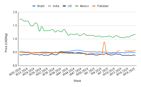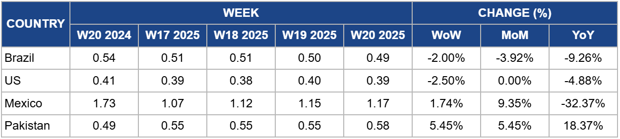 In W20, Mexico's sugar prices rose to USD 1.17/kg, marking an increase of 1.74% WoW, despite a steep 32.27% YoY decline from USD 1.73/kg. The modest weekly increase may reflect localized supply constraints as the 2024/25 harvest concludes in regions like Morelos, where the Emiliano Zapata Sugar Mill recorded the highest national sugar yield (KARBE) at 133 kg/mt of cane. However, market conditions remain weak, with producers citing declining domestic and international prices.