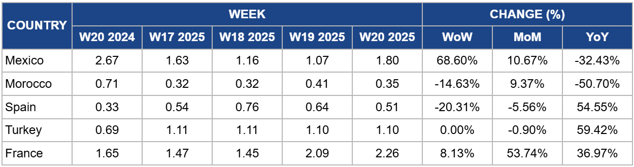 In W20, Morocco’s tomato prices fell to USD 0.35/kg, marking a 14.63% WoW decline and a steep 50.70% drop year-on-year (YoY) from USD 0.71/kg. This significant decrease is primarily due to government-imposed export quotas that cut daily shipments to Europe by 90% for round and grape tomatoes. The policy aims to boost domestic supply and curb inflation ahead of peak holiday demand. The resulting oversupply has driven prices down sharply, highlighting how regulatory measures can rapidly influence market conditions. Continued export restrictions may keep prices subdued locally but could tighten supply in European markets, potentially leading to price adjustments.