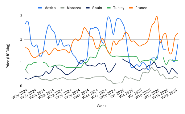 Mexico's tomato prices surged to USD 1.80/kg in W20, experiencing a sharp 68.60% WoW increase, yet remain 32.43% below last year's USD 2.67/kg. This volatility stems largely from ongoing trade uncertainties, notably the US decision to impose a 17.09% anti-dumping duty on Mexican tomatoes starting July 14, 2025.
