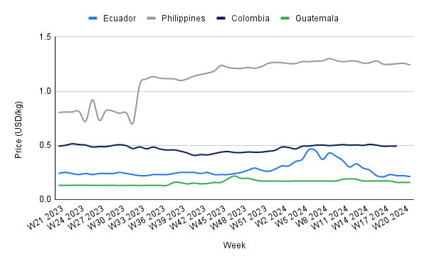 Banana prices in Guatemala remained stable at USD 0.16/kg in W21 and for the past weeks due to a consistent supply and steady demand. Favorable weather conditions ensured a regular harvest, while demand from key export markets remained strong and predictable. Additionally, no significant transportation or production disruptions contributed to the price stability.