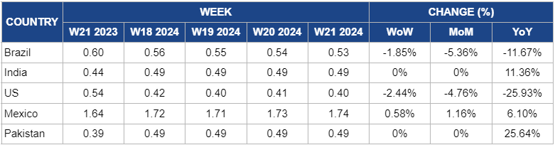Sugar prices in the US dropped by 2.44% WoW to USD 0.40/kg in W21 compared to USD 0.41/kg in W20. This decrease can be attributed to declined sugar futures prices due to improved global sugar supply prospects. According to the USDA, the sugarcane harvest in the 2023/24 season exceeded market expectations at 705.2 mmt, 8% higher than the initial estimate of 652 mmt.