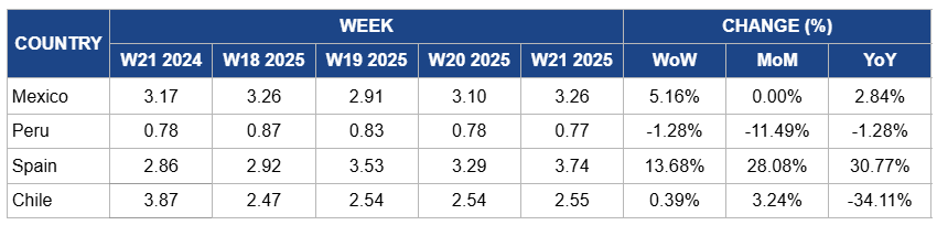 In W21, Peru's avocado prices dropped slightly by 1.28% WoW to USD 0.77/kg, marking an 11.49% MoM decrease and a 1.28% YoY decline. The price softening is due to an oversupply in key export markets, as export volumes surged. By the end of W19, Peru had reached a new export record of 11.9 thousand shipments, surpassing the previous year's weekly maximum. This sharp increase in supply, particularly in major destinations like Europe and the US, where shipments rose by 30% WoW, has placed downward pressure on prices. Despite the volume surge, the modest YoY price decline suggests a relatively stable market this season, especially compared to the more volatile conditions seen in previous years due to weather-related disruptions.