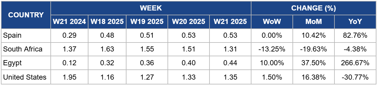 In W21, orange prices in Spain remained stable week-on-week (WoW) at USD 0.53/kg, reflecting a 10.42% month-on-month (MoM) increase and a significant 82.76% YoY surge. This price rise is mainly attributed to a tight supply situation resulting from continued lower yields in the 2024/25 season due to drought stress and erratic weather conditions. Reduced harvest volumes and smaller fruit sizes have limited market availability, especially for export-quality oranges. In addition, rising input and transport costs, and strong demand from local and European buyers, have supported higher pricing levels.