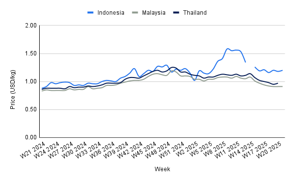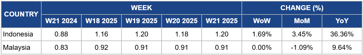 Indonesia's palm oil prices increased by 1.69% week-on-week (WoW) to USD 1.20 per kilogram (kg) in W21, supported by higher global vegetable oil prices and pre-policy adjustment buying activity. However, the recent increase in the CPO export levy from 7.5% to 10%, effective May 17 could reverse this trend in the coming weeks. The higher levy, combined with existing export burdens such as the export tax and domestic market obligation (DMO), which total USD 221/mt, is expected to raise export costs, making Indonesian palm oil less competitive globally. This could slow export volumes and pressure domestic prices downward, especially as refiners and exporters pass costs back to producers. Smallholders may face reduced farmgate prices for fresh fruit bunches (FFB), potentially weakening upstream margins.