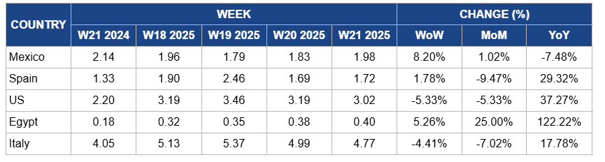 In W21, Mexico's strawberry prices increased by 8.20% week-on-week (WoW) to USD 1.98/kg, with a slight 1.02% month-on-month (MoM) rise. This uptick is due to the early conclusion of the Central Mexico strawberry season, which ended weeks ahead of schedule, leading to reduced supply and heightened demand in the market. An industry participant noted that the premature end of the season strained availability, causing prices to rise. However, YoY prices dropped by 7.48% due to a significant increase in overall production volumes and intensified competition from other producing regions, which exerted downward pressure on prices.