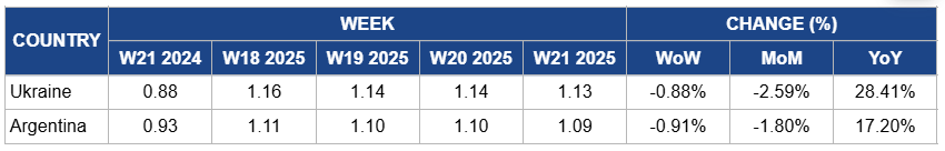 In W21, Ukraine’s sunflower oil prices declined slightly by 0.88% week-on-week (WoW) to USD 1.13 per kilogram (kg) and 2.59% month-on-month (MoM), partly due to seasonal variations and localized oversupply as farmers released stockpiled sunflower seeds earlier in the season, alongside competitive pressure from increased Russian exports to Southeast Asia and China earlier this year. However, inflationary pressures and staple food sensitivities have recently pushed retail prices up in May-25, indicating market volatility. Additionally, year-on-year (YoY) prices increased by 28.41% due to previous drought-induced production shortages and sustained strong global demand. Russia’s recent hike in export duties as of Jun-25 aims to regulate supply flows and stabilize prices, which may impact future competitive dynamics.
