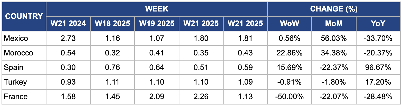 In W21, Mexican tomato prices rose 0.56% week-on-week (WoW) to USD 1.81/kg and surged 56.03% month-on-month (MoM). However, prices remained 33.70% below last year’s USD 2.73/kg. This price volatility mainly results from ongoing trade uncertainties, especially the United States (US) decision to impose a 17.09% anti-dumping duty on Mexican tomatoes starting July 14, 2025. The tariff dispute has already reduced Mexican agricultural exports by 3.2% overall and caused a 7.8% annual drop in tomato export revenues to USD 859 million in early 2025. Since over half of Mexico’s tomato production exports are primarily to the US, Mexican tomatoes represent nearly 70% of the US fresh tomato supply. These trade barriers threaten market stability and regional economies, particularly in Baja California, which depends heavily on exports.