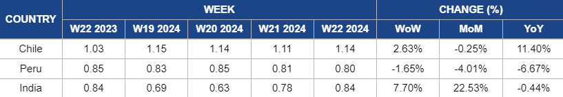 In W22, Peruvian grape prices continued declining for the second consecutive week, dropping by 1.65% WoW to USD 0.80/kg. This decrease adds to a 4.01% month-on-month (MoM) and a 6.67% YoY decline. Despite efforts to stabilize production in Ica and the minimal impact of El Niño, international price fluctuations and weak production in Piura have contributed to the ongoing downward trend in grape prices.