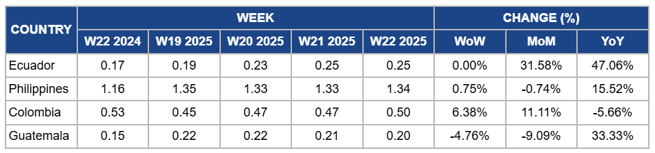 In W22, banana prices in the Philippines slightly increased by 0.75% WoW to USD 1.34/kg, with a 15.52% YoY rise. This growth is due to growing global demand driven by the government’s active promotion of the climate-resilient Balangon banana variety, especially in export markets like South Korea. Efforts to expand production and improve export infrastructure have supported steady price growth. However, MoM prices slightly declined by 0.74% due to seasonal fluctuations in supply and localized harvesting increases that temporarily eased market tightness.