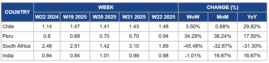 India's grape prices dropped slightly by 1.01% WoW to USD 0.98/kg in W22 due to localized harvest surges increasing short-term supply. However, MoM and YoY prices both increased by 16.67%, driven by strong local demand supported by improving export opportunities, particularly to Middle Eastern markets, and favorable weather conditions boosting fruit quality and yields compared to last year.
