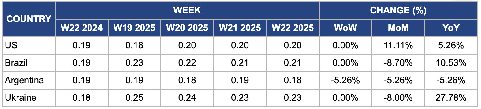 In W22, US corn prices held steady WoW at USD 0.20 per kilogram (kg) but rose 11.11% month-on-month (MoM) and 5.26% YoY. The price increase was due to supply constraints as planting neared completion in key production states. Despite the supply constraints, planting crop conditions were positive. In Iowa, corn planting reached 97% completion with 87% emergence, ahead of both 2024 and the five-year average, and 84% of the crop was rated good to excellent despite some dryness in topsoil and subsoil. Minnesota’s corn crop also strongly recovered after earlier weather challenges, with 76% rated good to excellent. However, heavy rainfall caused planting delays in Southern Illinois.