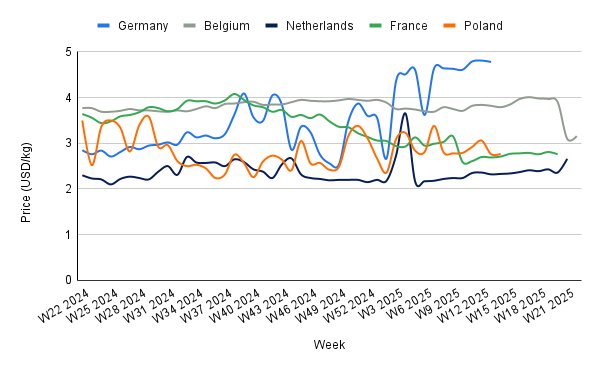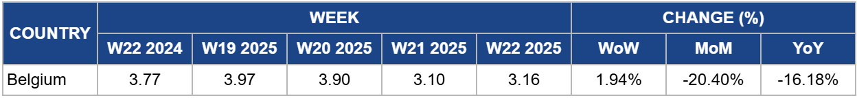 In W22, Belgium's wholesale milk price rose to USD 3.16/kg, an increase of 1.94% week-on-week (WoW) but down 20.40% month-on-month (MoM) from USD 3.97/kg. The sharp monthly decline reflects a temporary market correction as buyers paused amid uncertainty following a period of elevated prices. However, the 16.18% YoY decrease indicates weaker price levels compared to last year, suggesting that supply-side pressures such as lower milk production, higher feed and energy costs, and stricter environmental regulations are being offset by other factors, such as softer demand and increased imports. Despite the recent dip, prices could stabilize or rebound if structural supply constraints persist.