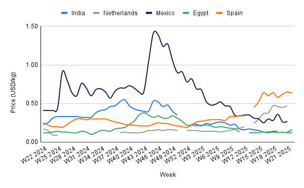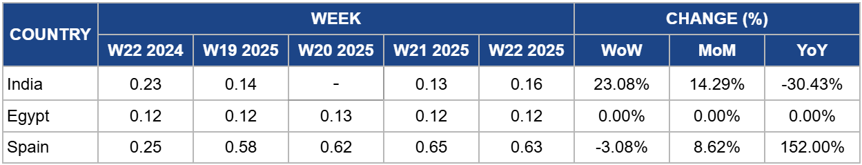 In W22, Spain's wholesale onion prices declined by 3.08% WoW to USD 0.63/kg but remained 152% higher YoY, rising from USD 0.25/kg. The sharp annual increase is mainly due to a significant production shortfall in 2024 caused by adverse weather conditions, including droughts, which reduced yields and tightened supply.