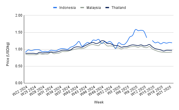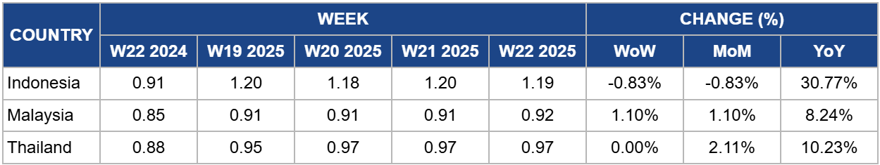 Indonesia’s palm oil prices slightly declined by 0.83% week-on-week (WoW) to USD 1.19/kg in W22. However, they remain significantly higher by 30.77% year-on-year (YoY) than USD 0.91/kg. In W22, the government decided to lower the crude palm oil (CPO) reference price to USD 856.38/mt for Jun-25 directly reducing the export tax to USD 52/mt from May-25's USD 74/mt. This tax adjustment, combined with a fixed 10% levy on CPO exports and additional levies on refined products, is designed to balance export competitiveness with domestic supply needs. The reduced export tax will likely encourage higher export volumes in the short term, potentially supporting price stability or moderating declines. However, persistent global supply dynamics and Indonesia’s policy measures will continue to influence future price trends.