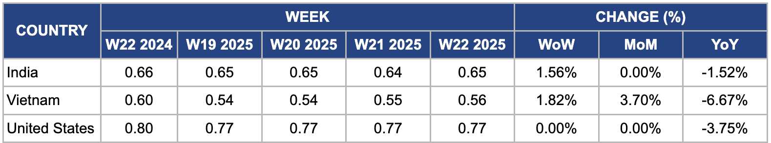 In W22, India’s wholesale rice prices increased slightly by 1.56% week-on-week (WoW) to USD 0.65/kg. While the recent easing in export prices put downward pressure on prices, the domestic market saw mild upward pressure due to early and above-average monsoon rains improving crop prospects and farmer confidence. This favorable monsoon has raised expectations of a strong 2025 harvest, encouraging some price firmness locally. Moreover, India’s removal of the minimum export price for basmati rice and ongoing trade negotiations with the US suggests a potential for expanding export opportunities, which supports domestic price stability. Thus, while international prices have softened, domestic supply optimism and export market potential have combined to push wholesale rice prices slightly higher in India.