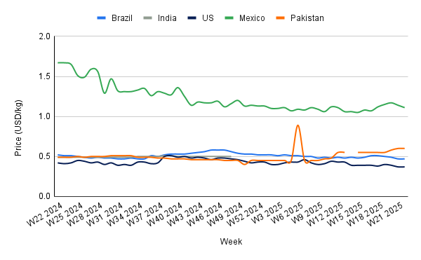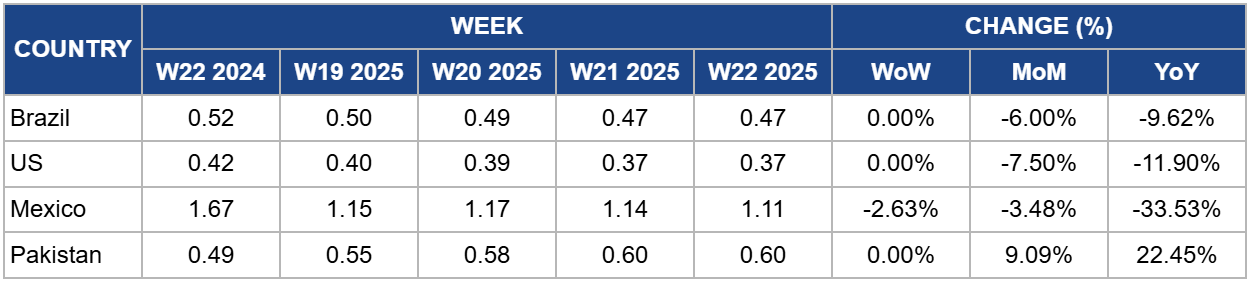 Mexico's sugar prices experienced a decline in W22, with prices dropping to USD 1.11/kg, reflecting a 2.63% WoW decline and a significant 33.53% year-on-year (YoY) drop. The imposition of 25% tariffs by the US on key Mexican agri-food exports, including sugarcane, presents a severe risk to the Mexican sugar market. These tariffs could disrupt exports, leading to an oversupply in the domestic market and potential price volatility.