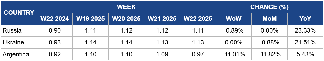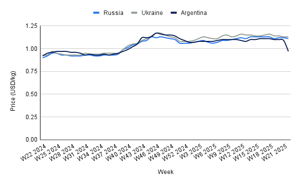 In W22, Russia's sunflower oil prices fell marginally by 0.89% week-on-week (WoW) to USD 1.11 per kilogram (kg), yet remained significantly higher YoY, up 23.33%. The annual increase reflects constrained sunflower seed supply due to adverse weather conditions and rising production costs. While the Russian government halved export duties in Apr-25, the impact on prices was limited by a simultaneous increase in the reference price, curbing downward momentum. Strong export performance, including an increase in shipments to Singapore in early 2025, underscores sustained international demand.