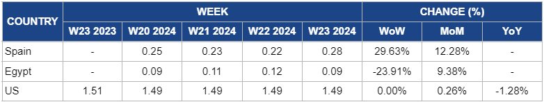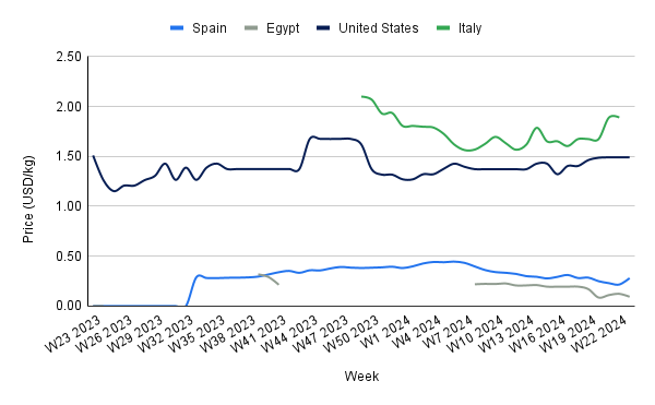 Spain's orange prices increased to USD 0.28/kg in W23, marking a 29.63% week-on-week (WoW) increase compared to USD 0.22/kg in W22. This increase can be attributed to low supply and the influx of Egyptian oranges in the Spanish market.