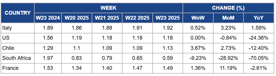 In France, apple prices increased slightly by 1.36% WoW to USD 1.49/kg in W23 and jumped 11.19% MoM, driven by a tightening supply. Early-season harvest forecasts were revised downward by around 4% due to heat and drought stress, which reduced yields, particularly for popular varieties like Gala and Golden Delicious. At the same time, strong local and export demand added further pressure to the already limited supply. However, prices edged down 2.61% YoY, reflecting a fuller market than last year. Stocks were about 7% higher at the start of the campaign, and although export volumes remained solid, they were slightly below prior-year levels.
