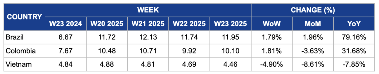 Colombian coffee prices in W23 was USD 10.10/kg, showing a 1.81% WoW increase and a 31.68% YoY rise. However, prices experienced a 3.63% MoM decline, reflecting short-term market adjustments. The YoY price increase is supported by a significant 27% drop in May production due to heavy rainfall, which disrupted supply. Meanwhile, the stronger Colombian peso has exerted downward pressure on domestic prices by reducing local currency returns on US dollar-denominated exports. Rising global arabica inventories and macroeconomic uncertainties, including US fiscal concerns, have also contributed to bearish sentiment, causing the recent MoM price dip. Despite these factors, a 12% increase in exports signals a recovering supply base, which helps moderate price volatility and supports steady demand.