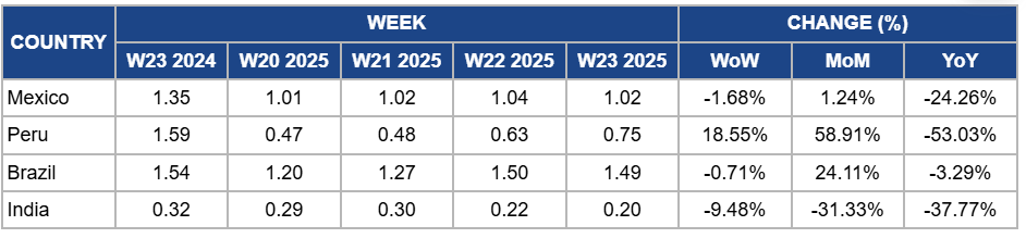 In Peru, mango prices rose sharply by 18.55% WoW to USD 0.75/kg and increased by 58.91% MoM in W23. This rebound was driven by a sudden and sharp reduction in supply as regions like Piura and Lambayeque reached the end of their peak harvest, tightening market availability. At the same time, strong demand from Asian and European markets, combined with early-season stock shortages, intensified competition, and helped support the upward trend. However, prices remain 53.03% lower YoY, reflecting the lingering impact of last season’s severe oversupply, during which growers reportedly dumped around 800 thousand mt of excess fruit, and export shipments fell sharply. As a result, last year's price collapse skews the YoY comparison, suggesting that current prices are stabilizing toward more typical levels rather than reaching new highs.