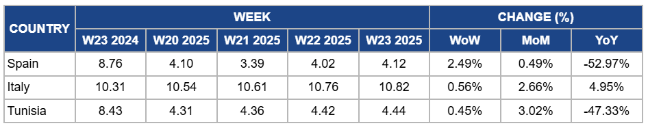 In W23, Italy’s olive oil prices edged up by 0.56% WoW to USD 10.82/kg, alongside a 2.66% MoM increase and a 4.95% YoY gain. This modest rise reflects continued structural supply constraints: 2024/25 production remains well below par, hampered by persistent drought, extreme heat, and erratic rainfall, particularly in southern regions like Puglia and Sicily, which have reduced yields by around 20% to 50% in some areas. Boosting costs further are inflation-driven increases in labor, fertilizers, energy, and pest control (especially against olive fruit flies and Xylella fastidiosa), forcing farmers to accept higher prices. Meanwhile, with sustained international demand, Italy exported over USD 3.4 billion in olive oil during 2024 on the back of rising global interest and has kept upward pressure on wholesale prices despite production challenges.
