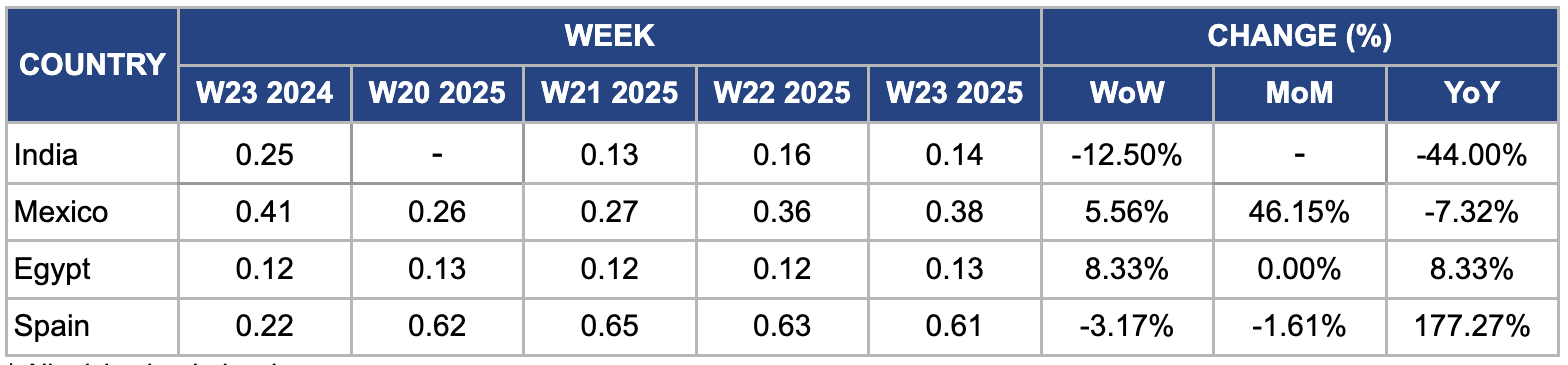 In W23, Mexico's wholesale onion prices increased 5.56% WoW and 46.15% month-on-month (MoM) to USD 0.38/kg. This sharp rise was due to seasonal supply tightening, as harvest volumes in key producing states such as Zacatecas and Guanajuato were reduced by irregular rainfall in late May-25, delaying field operations and limiting fresh arrivals in major wholesale markets. Moreover, domestic consumption surged ahead of national holidays, and export demand to the United States (US) picked up, draining available stocks. With Mexico producing around 1.67 mmt of onions in 2024 and expecting modest growth in acreage through 2026, this temporary supply-demand imbalance triggered the observed price increases.