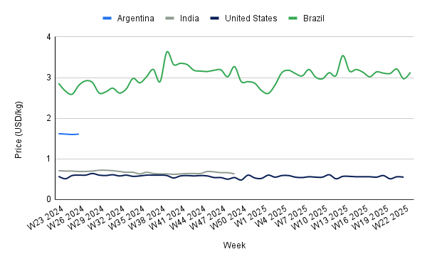 In W23, Brazil's peanut prices rose by 5.39% week-on-week (WoW) to USD 3.13 per kilogram (kg), a 9.44% YoY increase from USD 2.86/kg. This price uptick reflects heightened seasonal demand driven by the Jun-25 festivities, during which peanuts are central to traditional culinary practices. Despite a projected record 2024/25 national harvest of 1.16 mmt primarily from São Paulo and Mato Grosso do Sul, short-term price pressures persist due to localized supply constraints, particularly in Paraná, which contributes just 0.7% of national output but plays a key role in meeting festival-driven consumption. While the larger harvest may ease prices in the medium term, continued strong domestic demand and potential logistical bottlenecks in smaller producing regions could sustain elevated prices through the festive period.