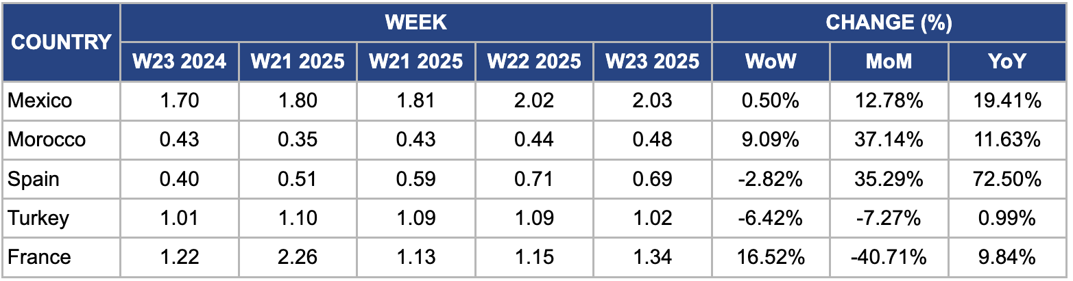 In W23, Mexican tomato prices rose slightly by 0.50% week-on-week (WoW) to USD 2.03/kg, with sharper increases of 12.78% month-on-month (MoM) and 19.41% year-on-year (YoY). These price movements largely reflect growing trade uncertainty following the US decision to impose a 17.09% anti-dumping duty on Mexican tomatoes starting July 14, 2025. The announcement has already contributed to a 3.2% decline in Mexican agricultural exports and a 7.8% drop in tomato export revenues, which fell to USD 859 million in early 2025. Since over 50% of Mexico’s tomato production is exported to the US, a market that depends on Mexico for nearly 70% of its fresh tomato imports, the pending tariff poses serious risks to price stability and the economic vitality of key producing regions like Baja California.