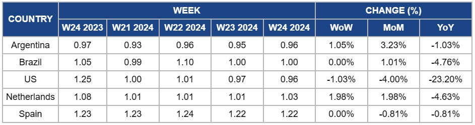 Soybean oil prices in the Netherlands increased 1.98% WoW to USD 1.03/kg in W24. Despite the price fluctuation in the Netherlands, global soybean oil prices face downward trend pressure from promising harvests in the US and Brazil. The Netherlands is one of the largest US soybean buyers, with the decreased future prices in CHX and Dalian Stock Exchange, the price will likely decline in the short term.