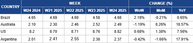 In W24, Australia’s National Young Cattle Indicator (NYCI) averaged USD 2.49/kg, reflecting a 1.19% WoW decline, but marking increases of 8.26% MoM and 18.57% YoY. According to Meat and Livestock Australia (MLA), the overall cattle market remained stable despite the dip in NYCI. Yardings fell by 24% to 56.8 thousand heads, as rainfall and the long weekend disrupted some sales. Among the categories, heavy steers were the strongest performers, with robust demand in Victoria pushing state-level prices higher. Meanwhile, most other indicators saw slight WoW declines, and restocker heifers failed to sustain the strong prices recorded in the previous week.