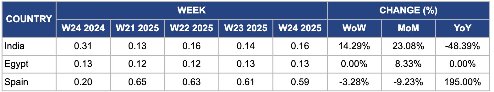 In W24, India's wholesale onion prices rose by 14.29% week-on-week (WoW) to USD 0.16/kg from USD 0.14/kg, mainly due to tightening supply conditions. The late Rabi onion crop, which typically sustains the market during the off-season, is seeing reduced arrivals in key wholesale markets such as Lasalgaon and Nashik due to lower production and poor quality storability this season. According to the National Horticultural Research and Development Foundation (NHRDF), Rabi output will be 10 to 15% lower YoY due to inconsistent pre-monsoon weather, including unseasonal rains and high temperatures. Moreover, onion storage levels have declined, with traders and stockists holding back supplies in anticipation of better prices.