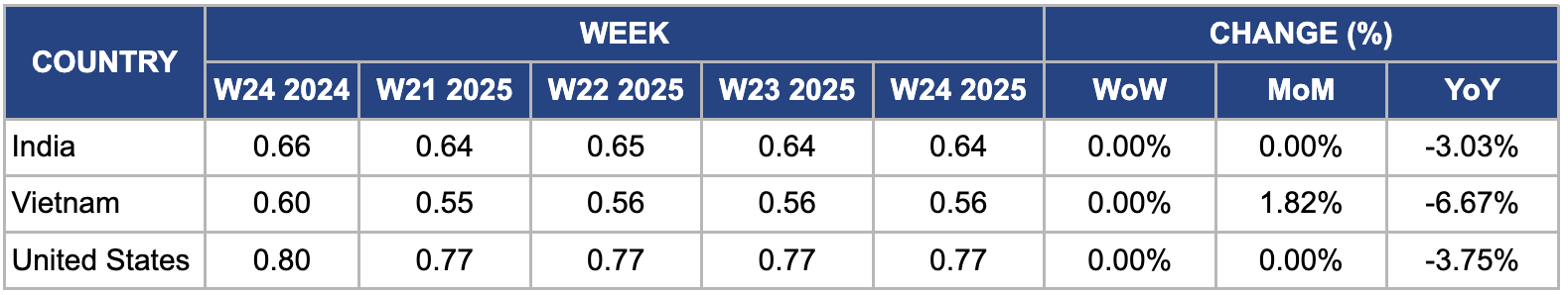 In W24, US rice prices remained unchanged WoW and MoM at USD 0.77/kg but registered a 3.75% YoY decline. This decrease primarily reflects improved production conditions in key rice-producing states like Arkansas and California, which boosted domestic output and eased upward price pressure. Unlike the 2024 season, when droughts and disruptions along the Mississippi River strained logistics and elevated costs, the 2025 season has seen more favorable weather and smoother supply chain operations. Furthermore, the US has faced tough competition from leading exporters such as Vietnam and India, whose more competitively priced rice has reduced demand for US shipments. Despite stable domestic consumption, increased supply and reduced export demand drove prices lower than the previous year.