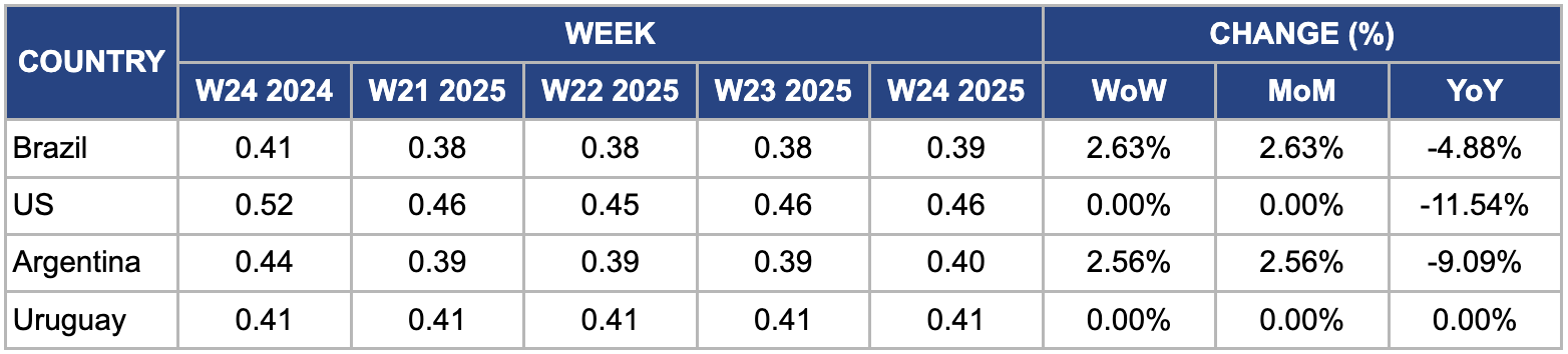 In W24, Uruguay’s soybean prices remained unchanged at WoW, MoM, and YoY at USD 0.41/kg, indicating a stable market environment. This price stability reflects a balanced supply-demand situation. It is underpinned by an estimated 2024/25 soybean production of around 3.5 mmt with average yields of approximately 3.2 mt/ha due to generally favorable weather conditions throughout the growing season. The export performance also remained consistent, with Uruguay exporting about 2.8 mmt of soybeans in the first half of 2025 (H1-25), primarily to China and other key Asian markets. Moreover, currency stability, with the Uruguayan peso remaining steady against the US dollar, has helped control input costs and maintain export competitiveness, reinforcing the observed price equilibrium.