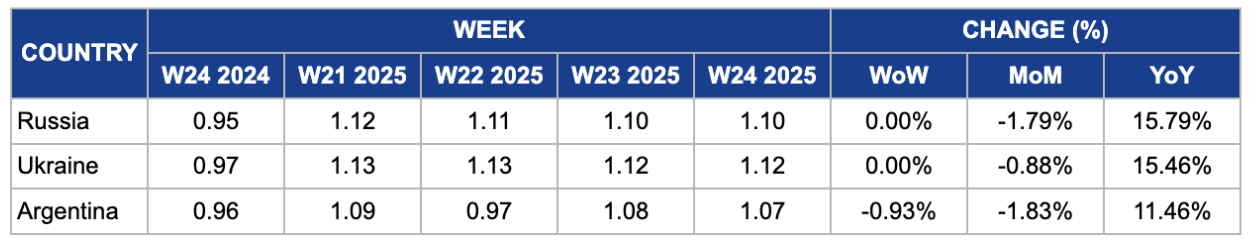 In Ukraine, sunflower oil prices held steady WoW in W24 at USD 1.12/kg, with a minor MoM decline of 0.88%, yet remained 15.46% higher YoY compared to W24 2024’s USD 0.97/kg. The WoW stability reflects a temporary market balance following early-season farmer sales that had already created a short-term oversupply, while processing demand remained weak due to lingering effects of a poor previous harvest and unattractive refining margins. The small monthly drop suggests ongoing but moderate bearish pressure from delayed sowing (due to cold, dry conditions), high domestic inventories, and reduced procurement interest as processors prioritized rapeseed. Despite these headwinds, the strong YoY increase indicates overall structural tightness in supply and recovery from the sharply depressed price levels seen during the prior year, even as Ukraine’s export performance weakens, particularly in Asia and the EU, amid stronger competition from Russian and Argentine sunflower oil.