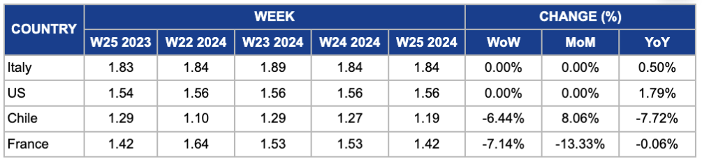 In France, apple prices decreased by 7.14% WoW in W25 to USD 1.42/kg, down from USD 1.53/kg in W24. There is a 13.33% MoM decrease and a 5.55% YoY decrease. The WoW decrease reflects short-term market adjustments, possibly influenced by seasonal shifts in supply and demand dynamics within the French apple market. The MoM and YoY decreases indicate a broader trend of declining prices over both monthly and yearly periods, suggesting ongoing challenges such as economic conditions, production costs, and market competitiveness during the low season for apples in France.